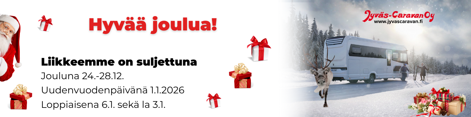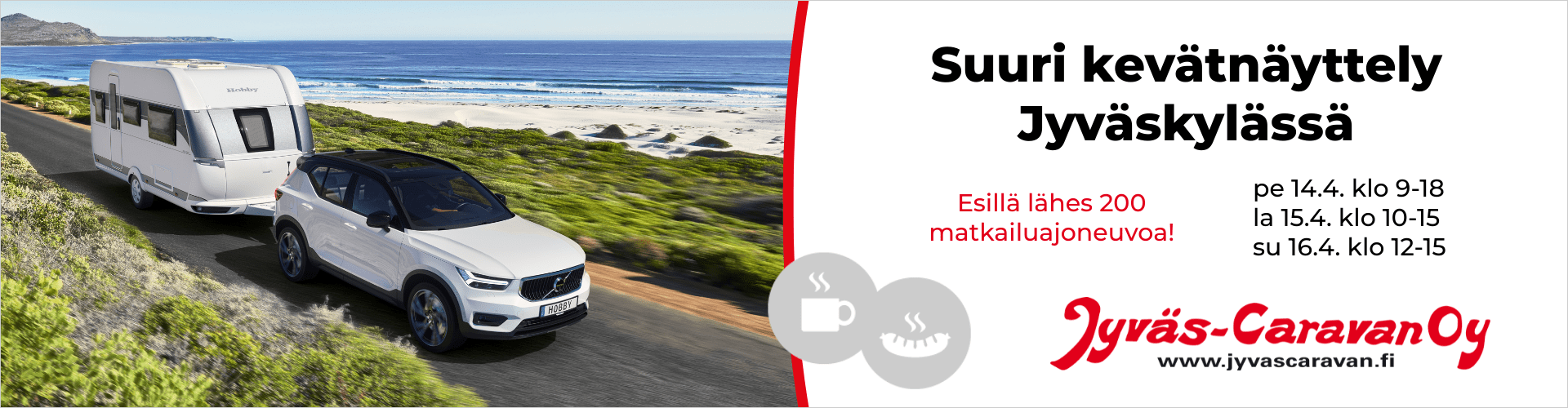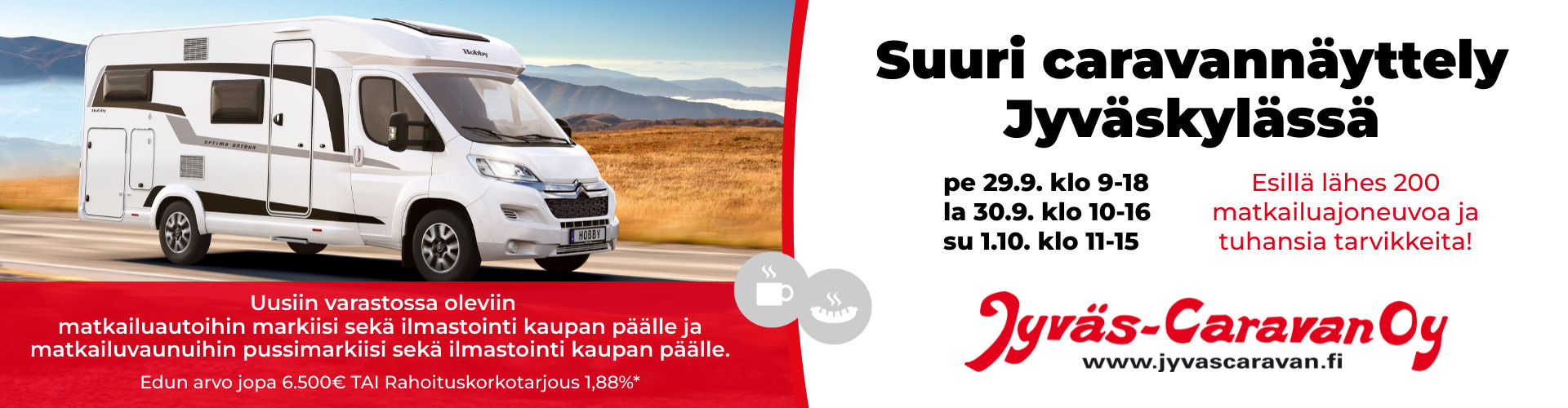 Jyväs-Caravan Oy on Suomen vanhimpia caravan-liikkeitä. Yli 3 500 m² caravan-suurmyymälämme sijaitsee Jyväskylässä, keskellä Suomea. Maahantuomme ja myymme matkailuautoja ja retkeilyautoja sekä matkailuvaunuja. Varastossamme on jatkuvasti laaja valikoima matkailuajoneuvoja. Ostamme myös käytettyjä asuntovaunuja ja asuntoautoja sekä lunastamme tarvittaessa loppuvelan rahoitusyhtiöltä.