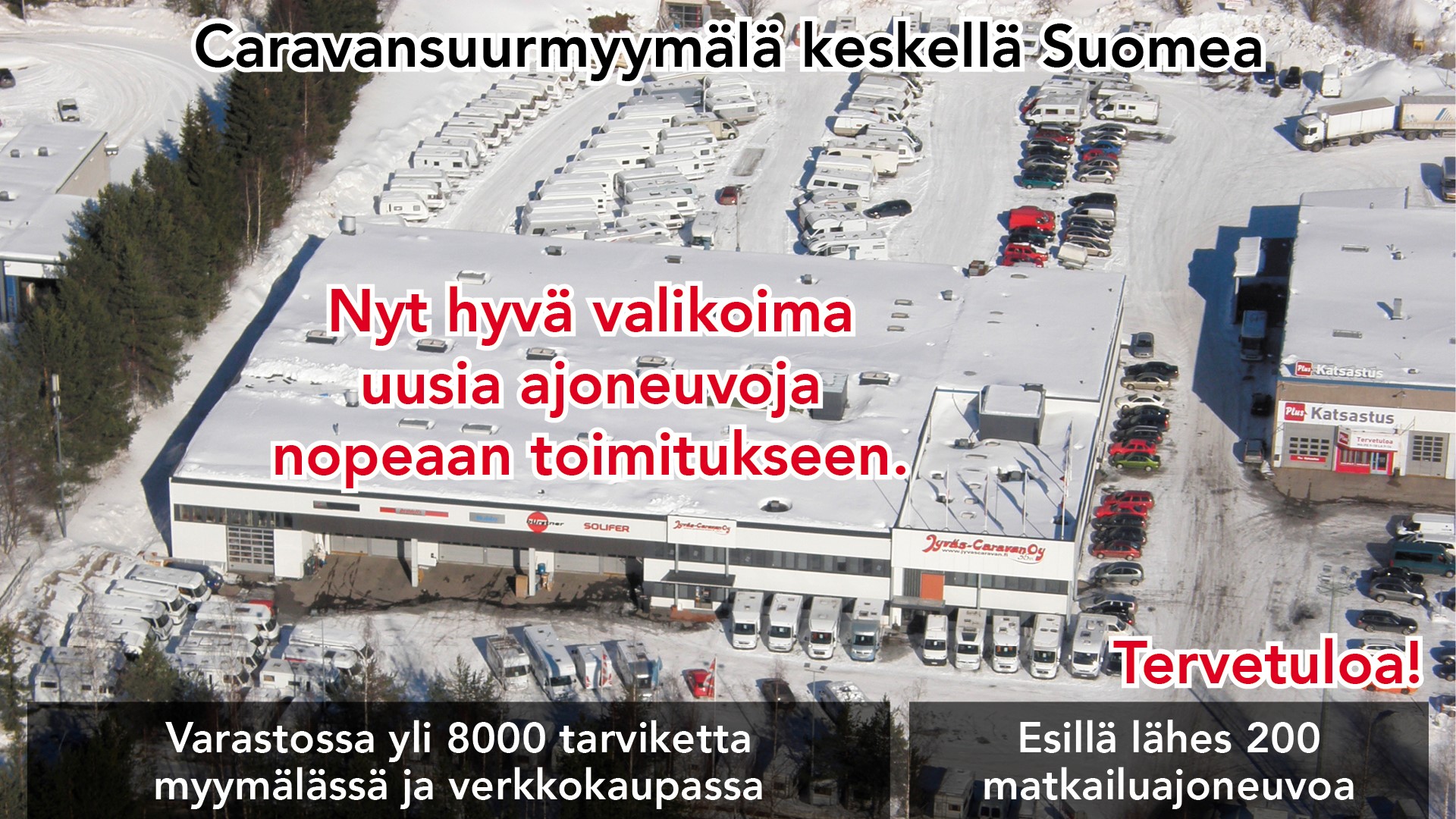 Yli 150 ajoneuvon valikoimastamme lämpöisissä sisätiloissa on kymmeniä matkailuajoneuvoa. Meillä on myös 700 m² caravan-tarvikemyymälä. Caravantarvikkeita ja varaosia voit tilata helposti myös verkkokaupastamme. Tutustu myös yrityksemme yritysesittelyvideoon ja kuvagalleriaan. Teitä palvelevat 25 alan ammattilaista. Tervetuloa tutustumaan!