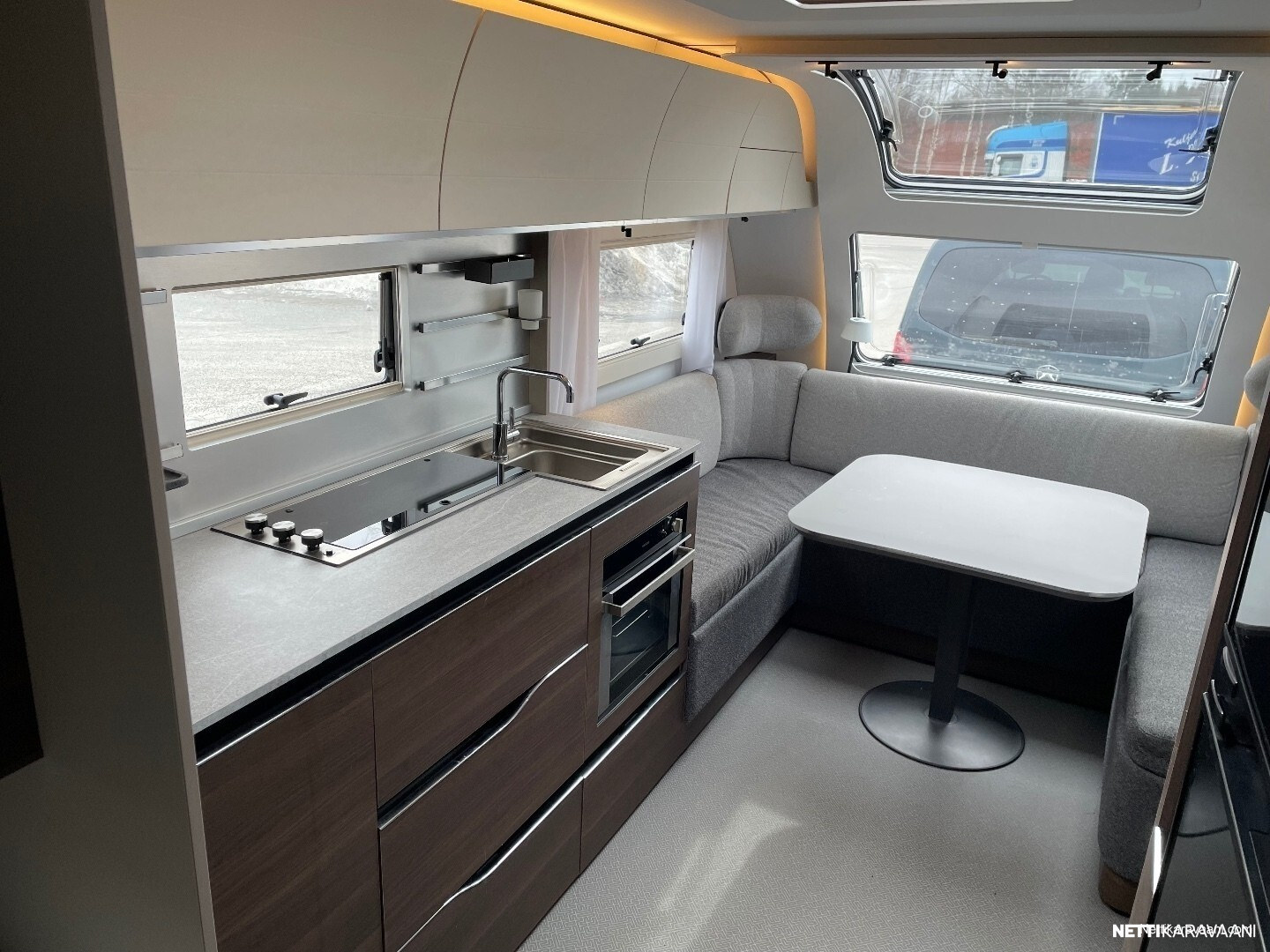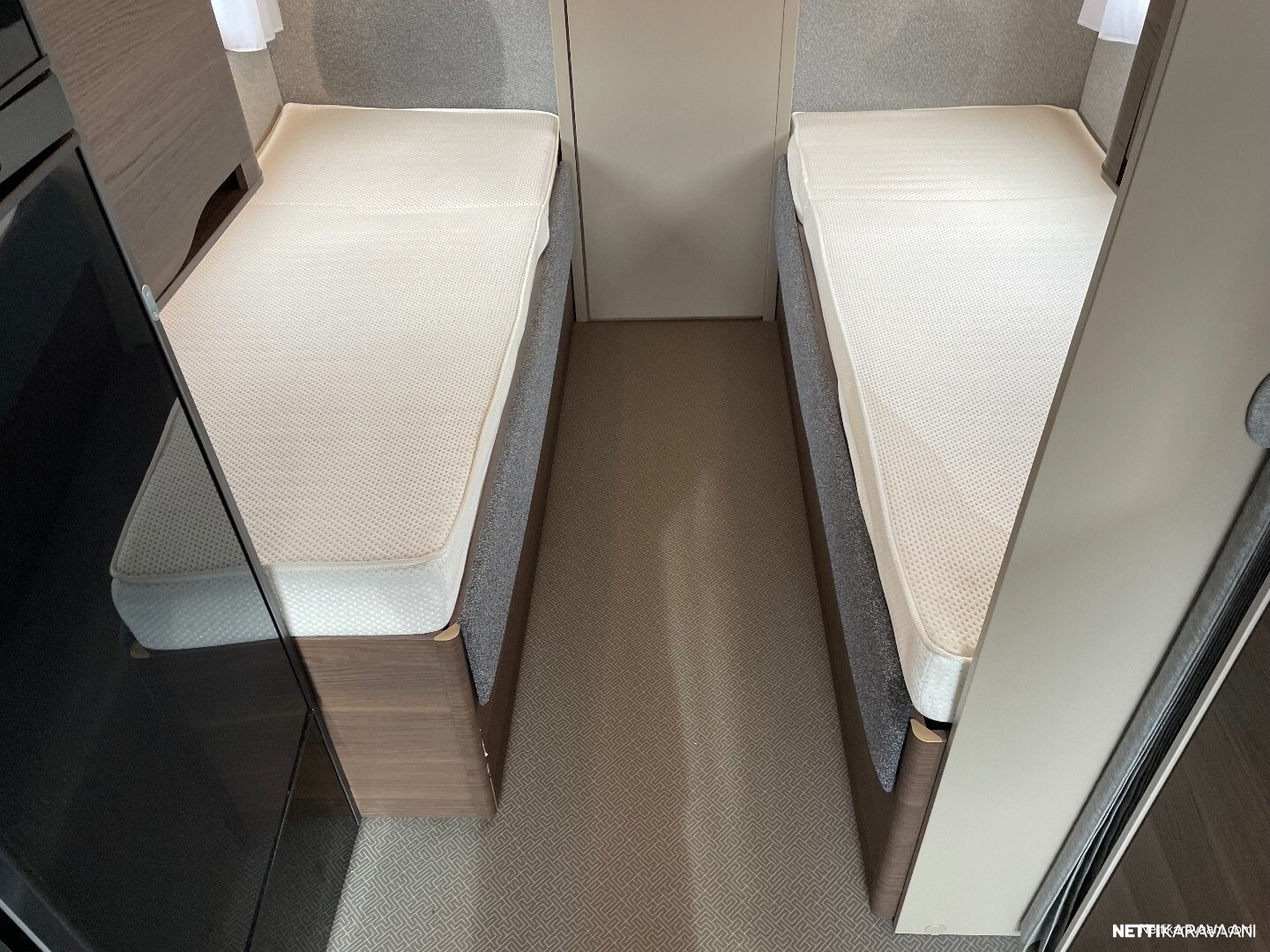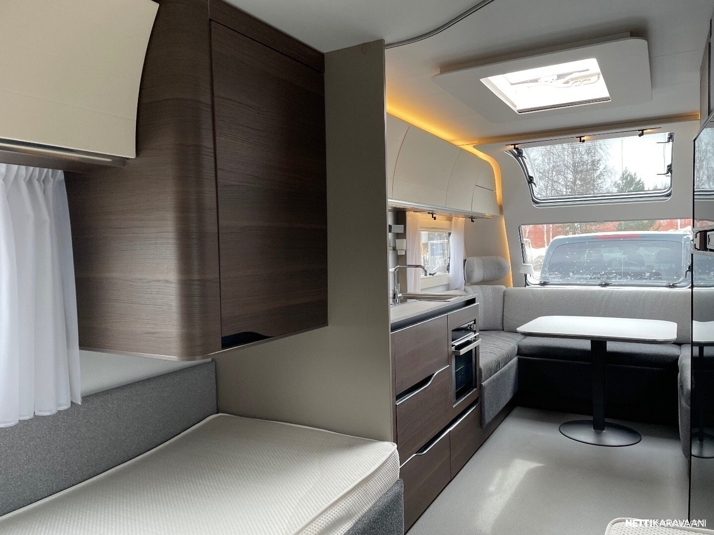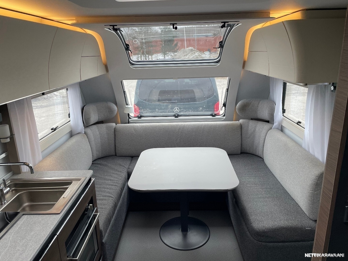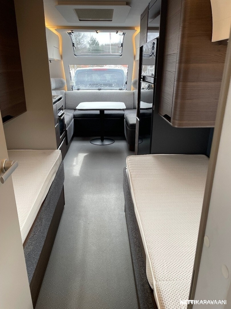 Avaralla pohjaratkaisulla varustettu Adrian ympärivuotiseen käyttöön soveltuva Alpina vähän käytettynä! Edessä tilava u-ryhmä suurella panoraamaikkunalla, keskellä iso keittiö uunilla, mikrolla ja suurella jääkaapilla. Takana tilavat erillisvuoteet sekä peräosassa koko vaunun levyinen kylpyhuoneosasto erillisellä suihkulla!