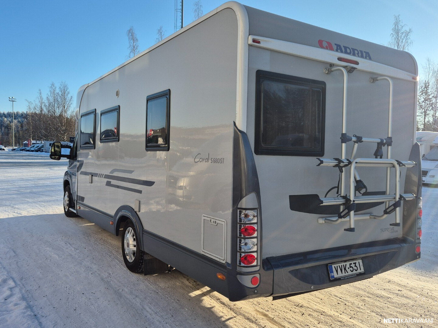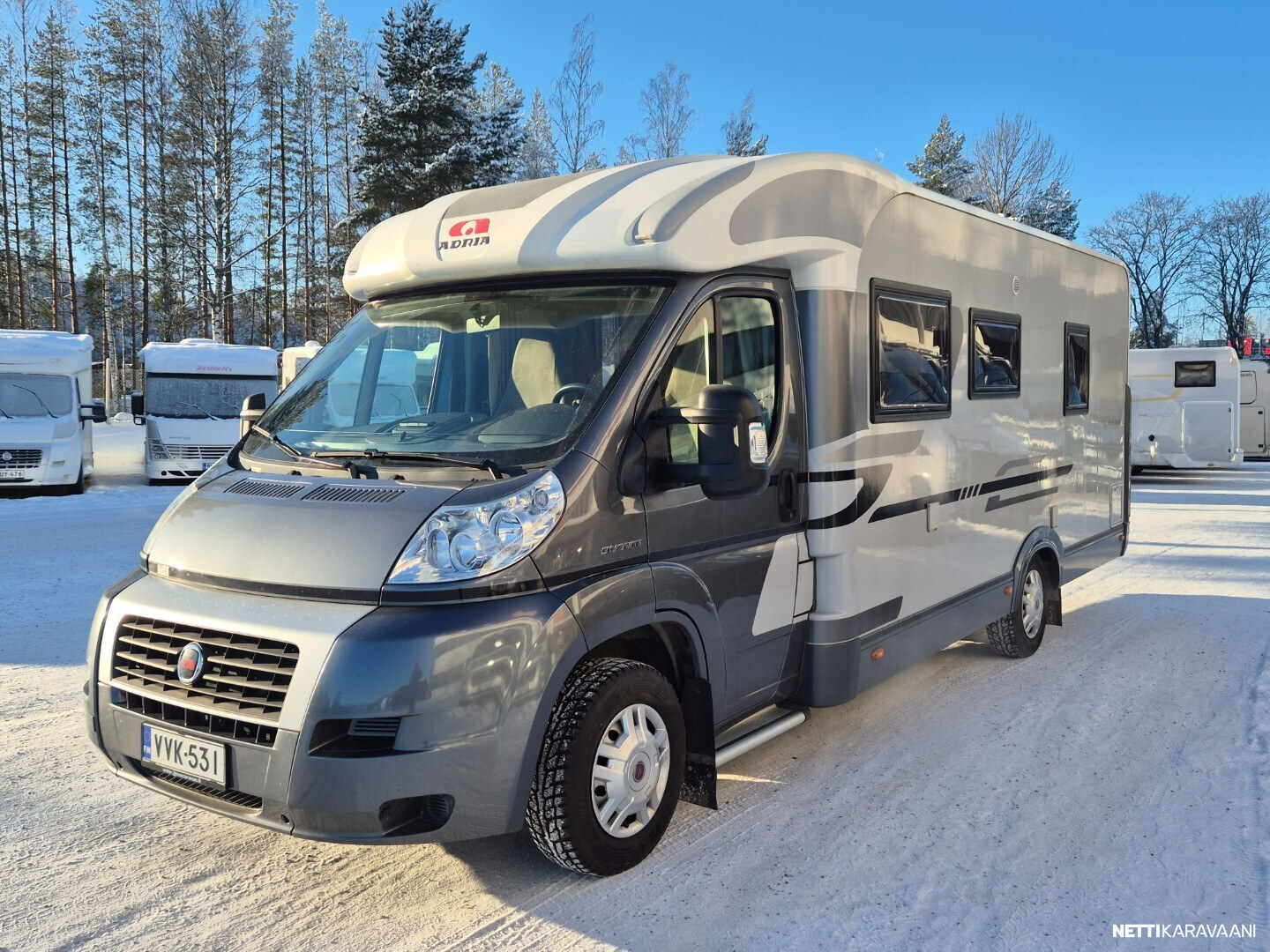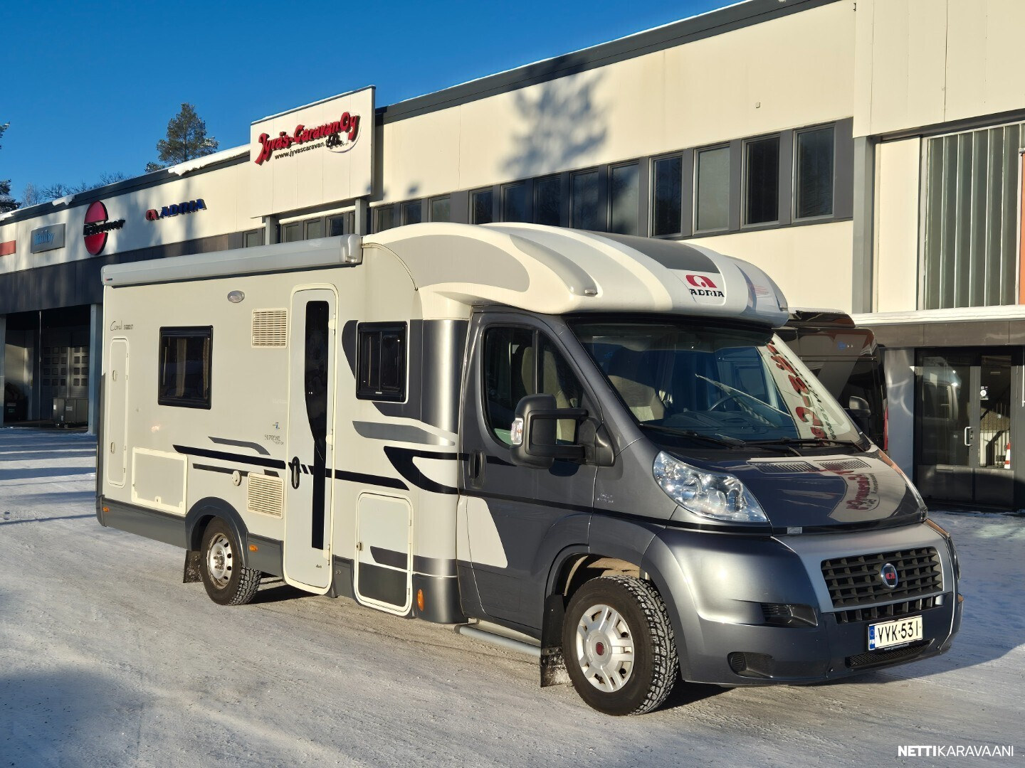Hienokuntoinen parivuode-Adria lähes koko auton levyisellä pesuhuoneella/pukeutumistilalla