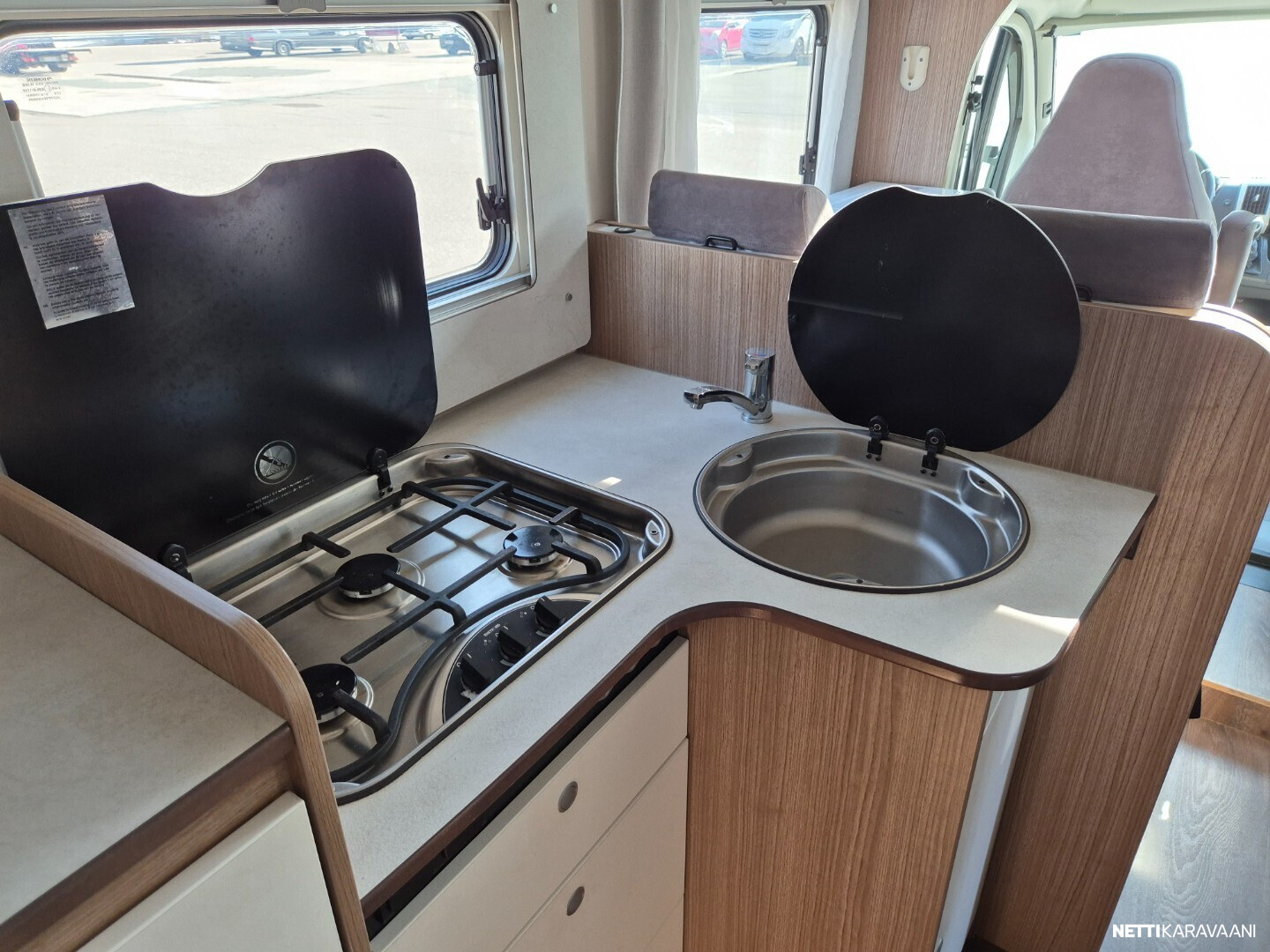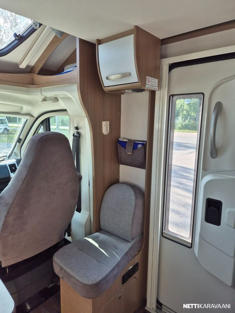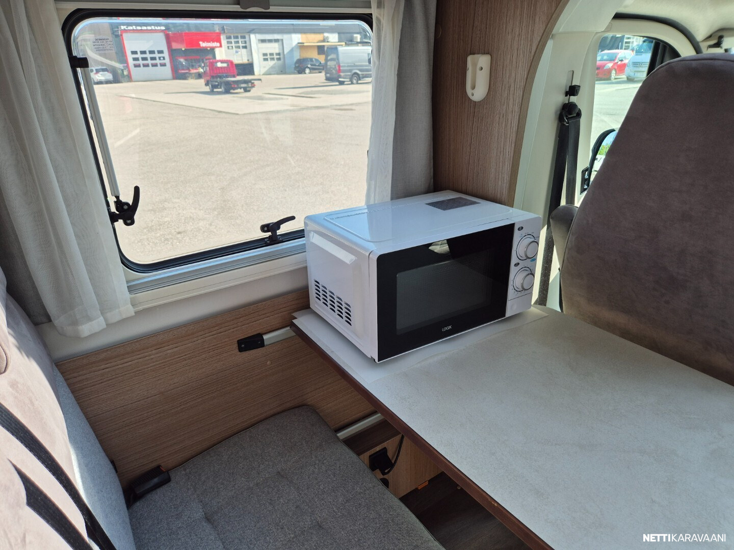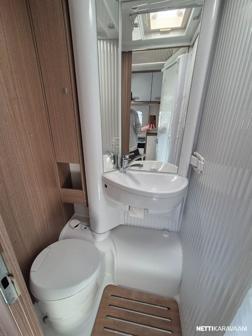 Basic-paketti sisältäen Panoraama kattoikkuna keittiön yläpuolella, kirkaslasinen kattoluukku 40×40, muoviset suihkuseinät, peili vaatenaulakolla, puinen suihkuritilä, pilotti-istuimet asunto-osan verhoilulla, pistorasia keittiön yläkaapistossa, pistorasia takatallissa
