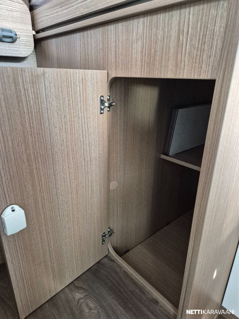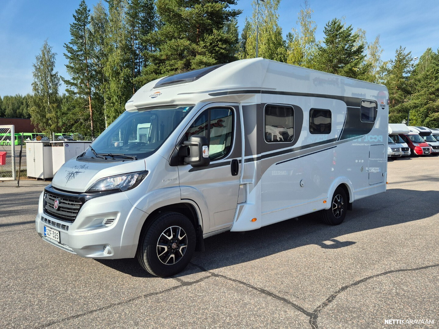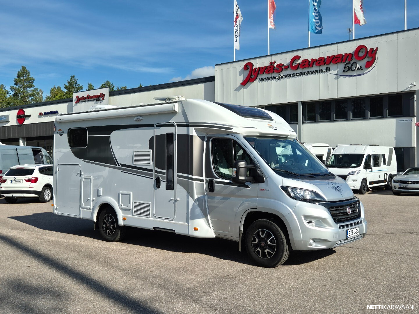 Basic-paketti sisältäen Panoraama kattoikkuna keittiön yläpuolella, kirkaslasinen kattoluukku 40×40, muoviset suihkuseinät, peili vaatenaulakolla, puinen suihkuritilä, pilotti-istuimet asunto-osan verhoilulla, pistorasia keittiön yläkaapistossa, pistorasia takatallissa