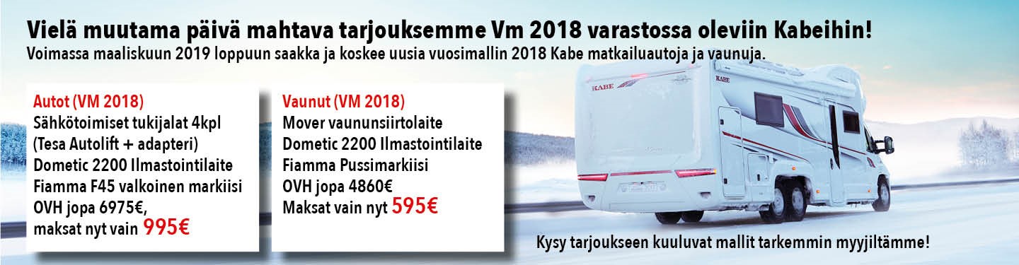 Tämä skandinaavivalmistaja on käsite matkailualalla. Kabe-matkailuvaunuun voikin luottaa aina. Kabe tavoittelee viidellä mallisarjallaan ainutlaatuista tarjontaa, joista löytyy varmasti jokaiselle jotain. Riippumatta mallin koosta, valmistaja tarjoaa mukavuutta ja korkeaa laatua tinkimättömästi kaikkiin kokoluokkiin.